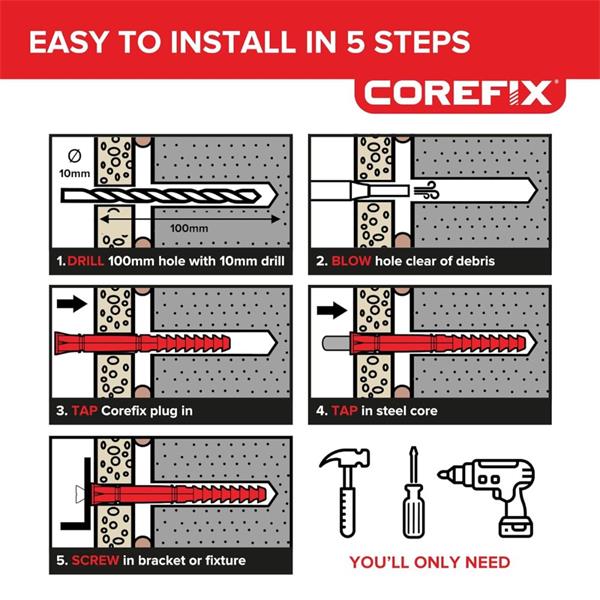 Introducing the Corefix Fixing 100 Trade Box24, your ultimate solution for reliable and robust wall anchoring. Our VERSATILE WALL ANCHORS are specifically crafted for a variety of construction and renovation tasks, providing secure options for flatscreen TVs, shelves, cabinets, radiators, and more. Designed to work seamlessly with any plasterboard over blockwork wall, these fixings make your home improvement projects easier and more effective.