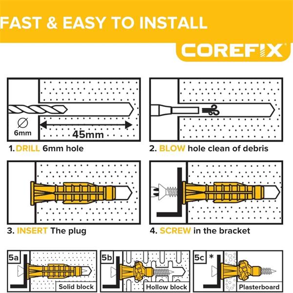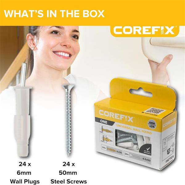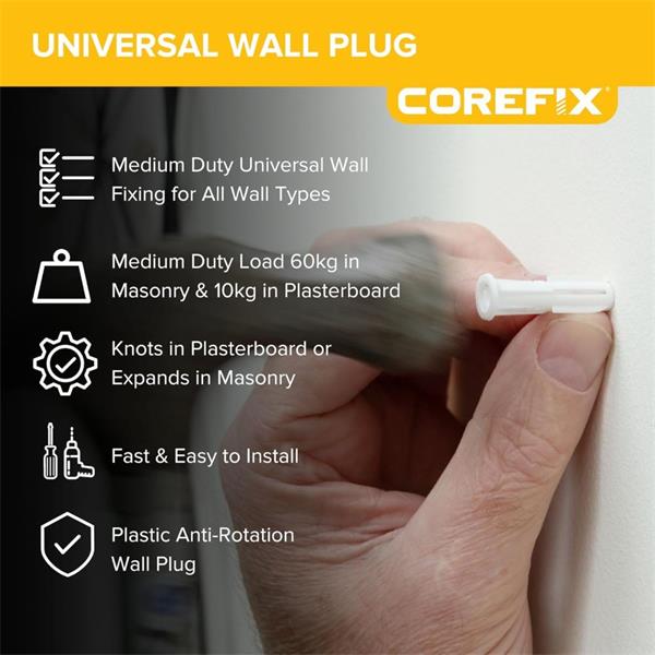 COREFIX ONE is a medium duty universal wall plug that excels in both plasterboard and masonry walls. Capable of supporting loads up to 60kg in masonry and 10kg in plasterboard, this product is supplied with the correct screws and optional plastic anti-rotation wall plugs (6x36mm or 8x51mm) depending on your selection.