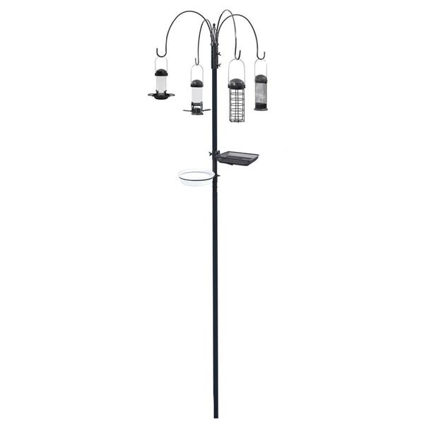 The Henry Bell Feeding Station includes 4 feeder hooks, a seed tray, and a water bath, plus Essentials Feeders for seed, peanut, fat balls, and suet bites/mealworms. Features a cool grey finish, with a height of 228cm.
