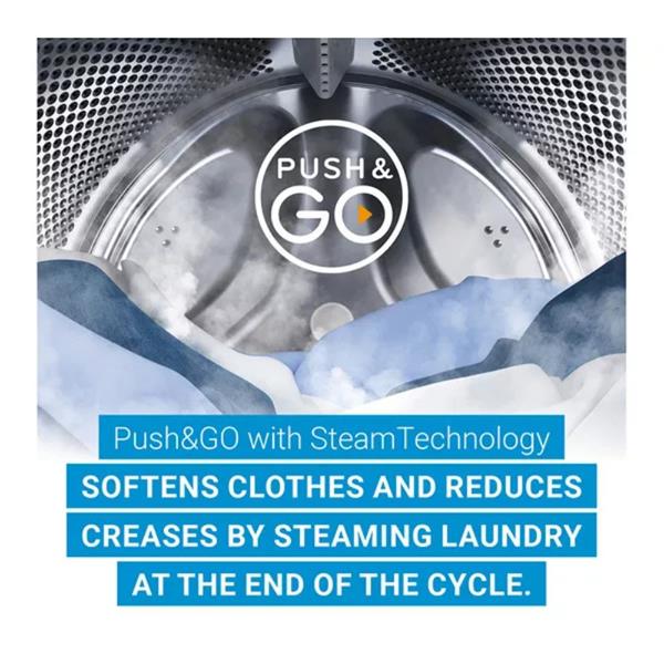 Its Push&Go with SteamTechnology feature releases steam at the end of a cycle to soften your clothes and reduce creases. So, it can cut your ironing time by around 30%. Choose from five Quick Cycle programs, all under an hour, designed for different fabrics like wool and delicates. And if time is really of the essence, the Express 14' Cycle washes small loads in just 14 minutes.