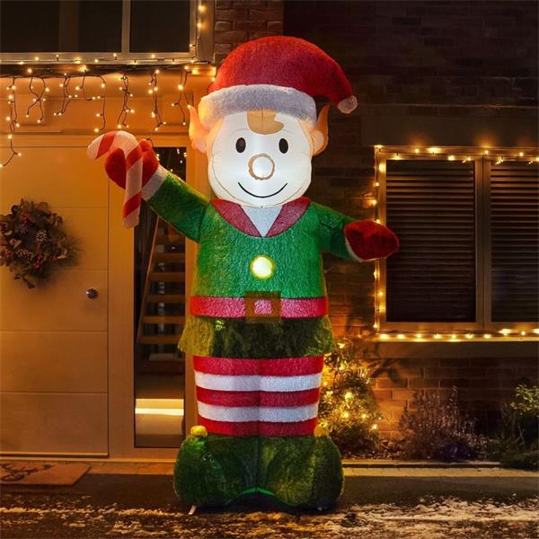 Perfect for parties, events, or a big family get-together, this eye-catching elf stands an impressive 2.4 metres tall, dressed in traditional candy-cane stripes and holding a sweet festive treat. Inside, 6 bright white LEDs create a soft, sparkling glow, illuminating his plush inflatable finish for all to admire.